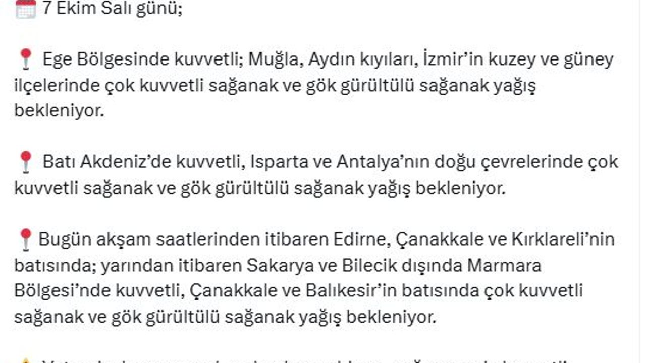 Bakanlığın sosyal medya hesabından yapılan açıklamada, "Meteoroloji Genel Müdürlüğü'nden alınan son bilgilere göre; 7 Ekim Salı günü Ege Bölgesi'nde kuvvetli; Muğla, Aydın kıyıları, İzmir'in kuzey ve güney ilçelerinde çok kuvvetli sağanak ve gök gürültülü sağanak yağış bekleniyor. Batı Akdeniz'de kuvvetli, Isparta ve Antalya'nın doğu çevrelerinde çok kuvvetli sağanak ve gök gürültülü sağanak yağış bekleniyor. Bugün akşam saatlerinden itibaren Edirne, Çanakkale ve Kırklareli'nin batısında; yarından itibaren Sakarya ve Bilecik dışında Marmara Bölgesi'nde kuvvetli, Çanakkale ve Balıkesir'in batısında çok kuvvetli sağanak ve gök gürültülü sağanak yağış bekleniyor. Vatandaşlarımızın sel, su baskını, yıldırım, yağış anında kuvvetli rüzgar, yerel küçük çaplı dolu, kıyı kesimlerde hortum riski ile ulaşımda aksamalar gibi olumsuzluklara karşı dikkatli ve tedbirli olmasını; yetkili mercilerin uyarılarını dikkate almalarını önemle hatırlatıyoruz" denildi. (DHA)