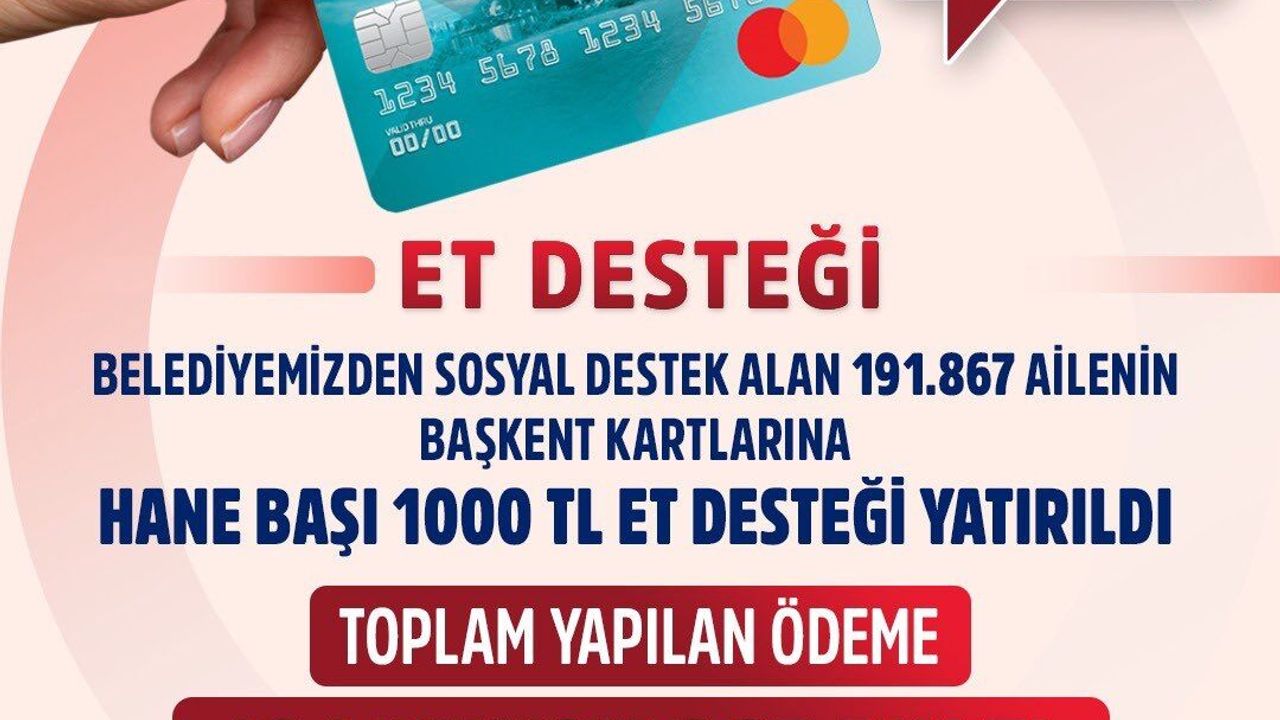 Ankara Büyükşehir Belediyesi, sosyal destek alan ailelere yönelik et desteği ödemesinin hesaplara yatırıldığını açıkladı. Belediyenin sosyal medya hesabından yapılan paylaşımda, 191 bin 867 ailenin Başkent Kart'ına hane başı 1000 TL et desteği aktarıldığı bildirildi.
