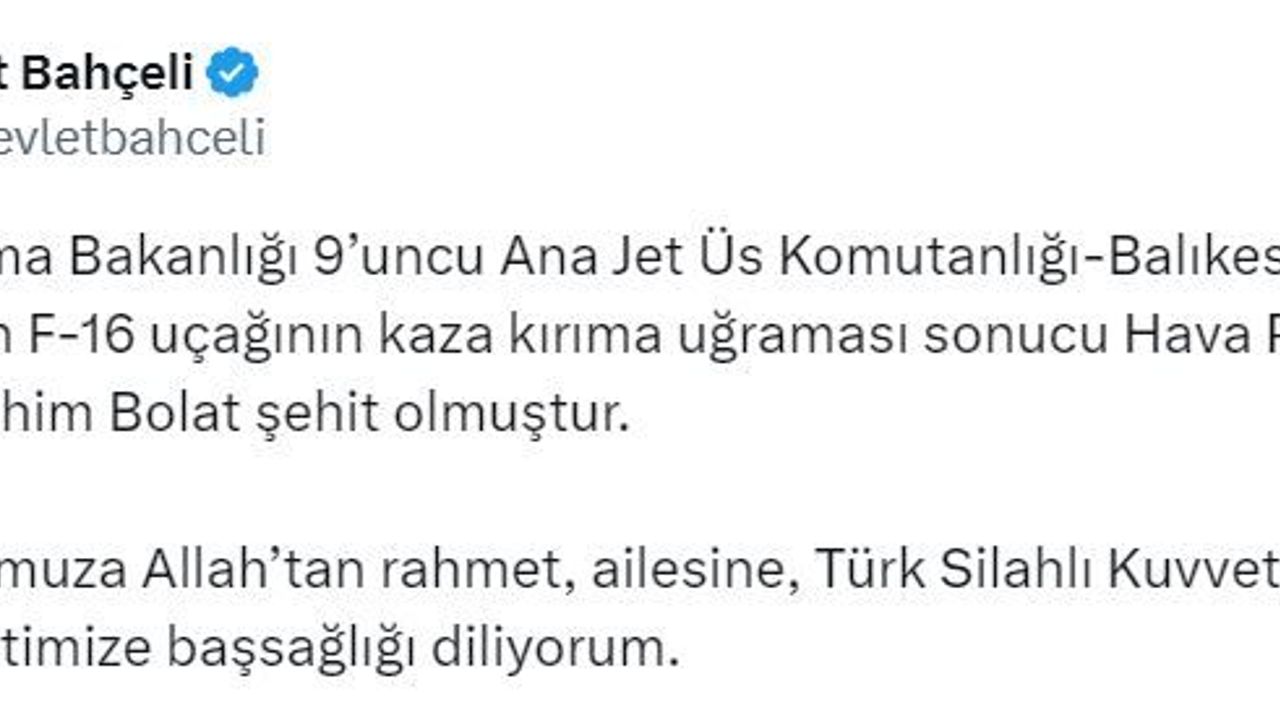 MHP Lideri Devlet Bahçeli, sanal medya hesabından yayımladığı mesajda, 'Milli Savunma Bakanlığı 9'uncu Ana Jet Üs Komutanlığı-Balıkesir'den kalkış yapan F-16 uçağının kaza kırıma uğraması sonucu Hava Pilot Binbaşı İbrahim Bolat şehit olmuştur. Şehit pilotumuza Allah'tan rahmet, ailesine, Türk Silahlı Kuvvetlerimize ve aziz milletimize başsağlığı diliyorum' dedi. (DHA)