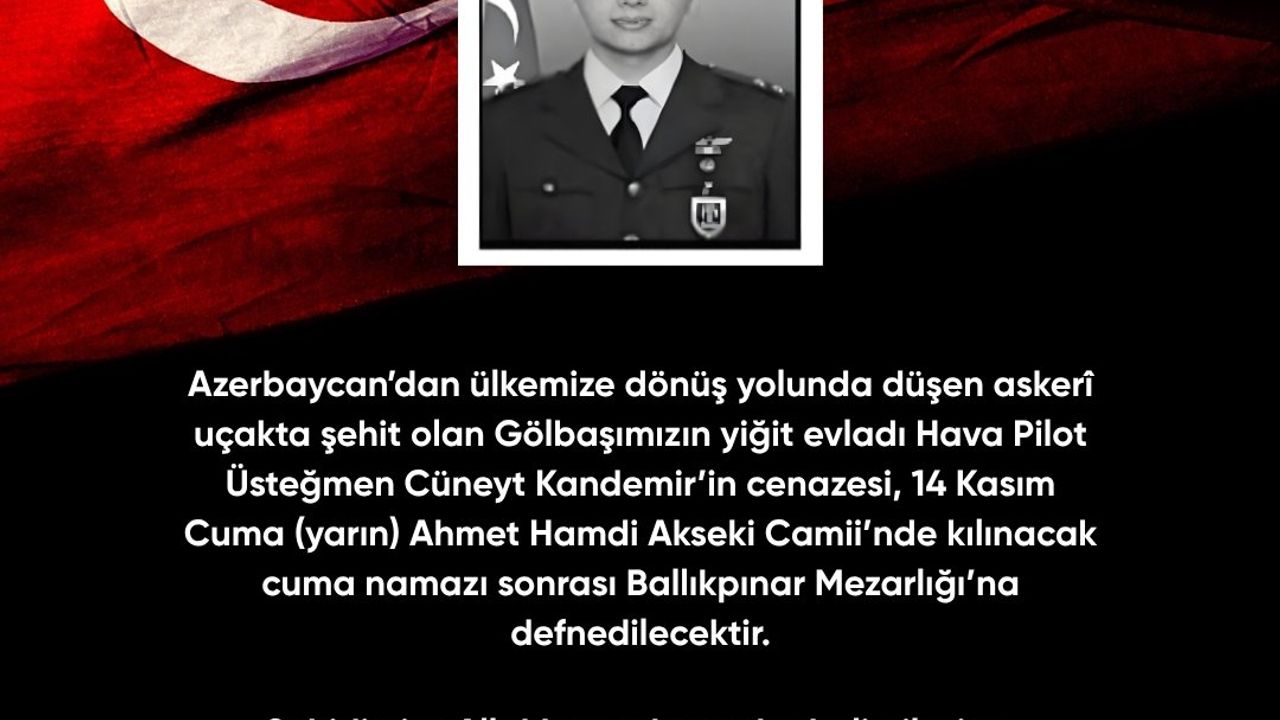 Başkan Odabaşı'nın konuya ilişkin paylaşımı şöyle: "Azerbaycan’dan ülkemize dönüş yolunda düşen askerî uçakta şehit olan, Gölbaşımızın yiğit evladı Hava Pilot Üsteğmen Cüneyt Kandemir’in cenazesi 14 Kasım Cuma (yarın) Ahmet Hamdi Akseki Camii’nde kılınacak cuma namazı sonrası Ballıkpınar Mezarlığı’na defnedilecektir. Şehidimize Allah’tan rahmet; kederli ailesine, yakınlarına ve aziz milletimize başsağlığı diliyorum." şeklinde konuştu.