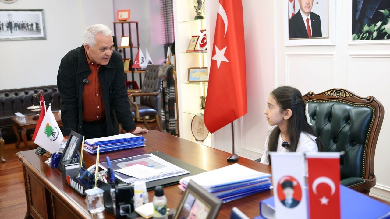 Başkanlık koltuğuna oturan Ömer ve Esila, kısa süreliğine belediye yönetimini üstlenerek hem yerel yönetim sürecini deneyimledi hem de geleceğe dair umut veren mesajlar verdi.