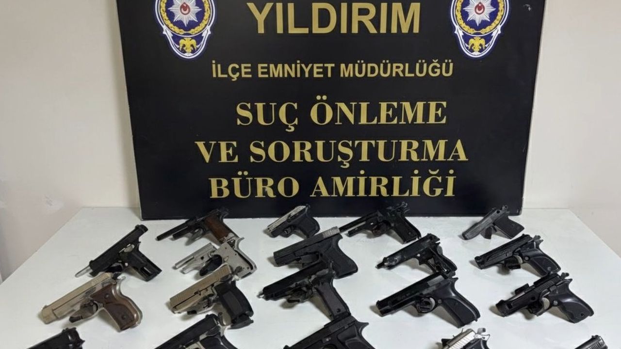 İl Emniyet Müdürlüğü Yıldırım Suç Önleme ve Soruşturma (SÖS) Büro Amirliği ekipleri tarafından Yıldırım ilçesindeki bir atölyede kaçak silah imalatı ve satışı yapıldığı bilgisine ulaşıldı. Belirlenen adreste 5 ruhsatsız tabanca, 14 kurusıkı tabanca, 27 şarjör, çeşitli çaplarda 63 fişek, silah yapımında kullanılan 14 araç gereç ve farklı türlerde toplam 19 silah parçası ele geçirildi. Atölyenin sahibi C.A. gözaltına alınırken, soruşturma sürüyor.