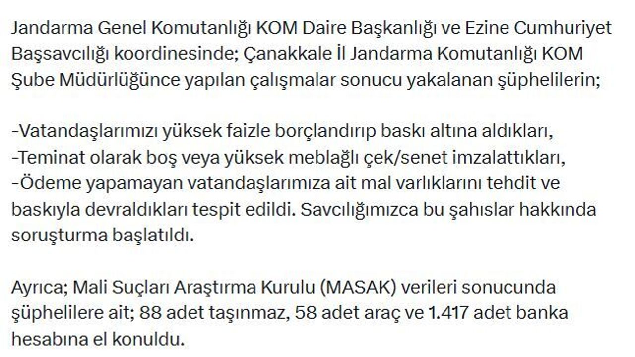 Bakanlığın sosyal medya hesabından yapılan açıklamaya göre; Çanakkale İl Jandarma Komutanlığı KOM Şube Müdürlüğü tarafından yapılan çalışmalar neticesinde 19 şüpheli yakalandı. Şüphelilerin; vatandaşları yüksek faizle borçlandırıp baskı altına aldıkları, teminat olarak boş veya yüksek meblağlı çek/senet imzalattıkları, ödeme yapamayan vatandaşlara ait mal varlıklarını tehdit ve baskıyla devraldıkları belirlendi. Mali Suçları Araştırma Kurulu (MASAK) verileri sonucunda şüphelilere ait; yaklaşık 2 milyar 800 milyon TL değerindeki 88 taşınmaz ile 58 araç ve 1417 banka hesabına el konuldu.