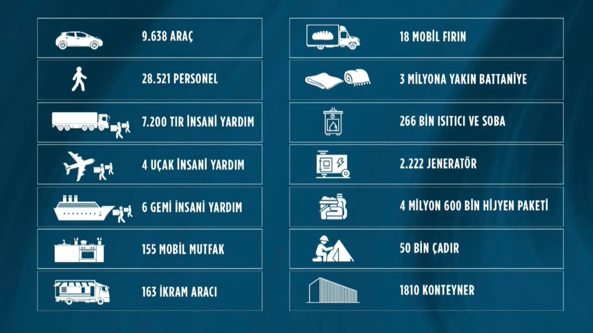 Depremin ilk günlerinde, AFAD’ın gözetiminde 9638 araç, 28.521 personelle deprem bölgesine ulaşıldı; 7200 TIR, dört uçak, altı gemi ile gıda, sağlık malzemesi, çadır ve diğer ihtiyaçlar taşındı. 155 mobil mutfak, 163 ikram aracı, 18 mobil fırın kuruldu; 3 milyona yakın battaniye, 266.000 ısıtıcı, 2220 jeneratör, 4.600.000 hijyen paketi, 50.000 çadır, 1810 konteyner AFAD bilgisi dahilinde teslim edildi.