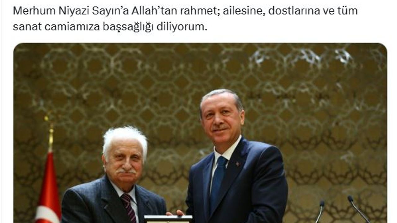 Cumhurbaşkanı Recep Tayyip Erdoğan, Cumhurbaşkanlığı Kültür ve Sanat Büyük Ödülü sahibi neyzen Niyazi Sayın'ın (98) vefatı nedeniyle başsağlığı mesajı paylaştı.