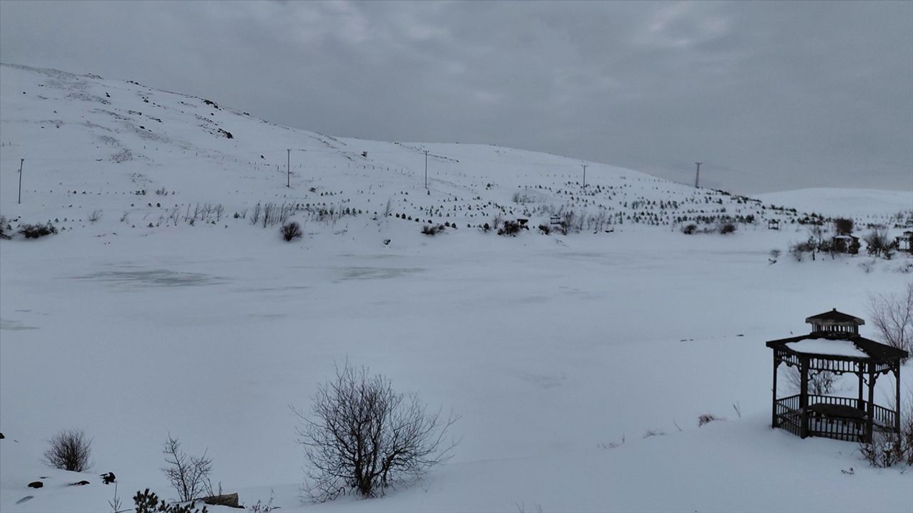 Yüzeyi donan gölet ve çevresindeki karla kaplı alanlar, ortaya çıkan manzarayla dikkat çekti. Doğayla iç içe oluşan buz ve kar görüntüleri, bölgede görsel bir şölen sundu.