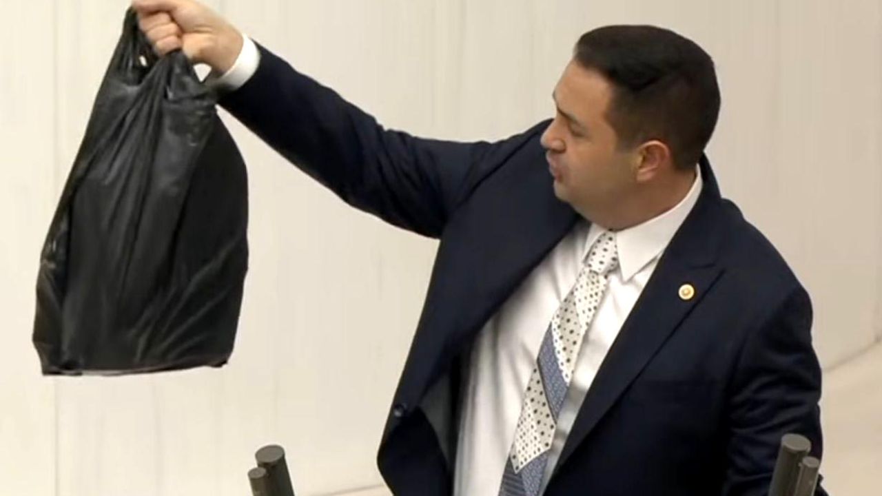 Genel Kurul’un devam eden oturumunda söz alan CHP Ankara Milletvekili Umut Akdoğan, partisinin “yolsuzlukların nedenlerinin araştırılması” başlıklı önergesi üzerine konuşmak için kürsüye siyah poşetle geldi.