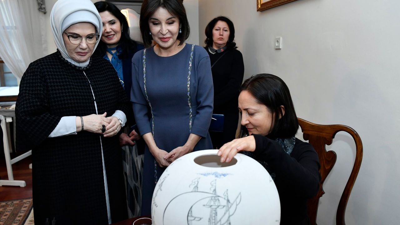 Cumhurbaşkanı Recep Tayyip Erdoğan'ın eşi Emine Erdoğan, Özbekistan Cumhurbaşkanı Şevket Mirziyoyev'in eşi Ziroat Mirziyoyeva ile Ankara Palas'ta görüştüi. Emine Erdoğan, Ankara Palas'ın girişinde karşıladığı Mirziyoyeva ile Hereke dokumaları, yıldız porselenleri ve diplomatik hediyelerin de aralarında olduğu Osmanlı ve Cumhuriyet dönemine ait seçkin eserlerden meydana gelen müzeyi gezdi. Milli Saraylar İdaresi Başkanı Yasin Yıldız, müzedeki eserleri yakından inceleyen lider eşlerine bilgiler verdi. Özellikle Anadolu nakış tekniklerini çok beğendiğini söyleyen Mirziyoyeva, ülkesinde de bu teknikle ürünler üretilmesini çok istediğini belirtti. Özbek halkının bu tür sanatlara ilgisi olduğunu aktaran Mirziyoyeva, Türkiye'nin bu konuda kendilerine destek vermesini memnuniyetle karşılayacağını dile geirdi. Lider eşleri Ankara Palas'ta, olgunlaşma enstitülerinde üretilen kitre bebek, çini ve seramik ürünler ile Türk işi, sırma, hesap işi ve beyaz iş gibi nakış teknikleriyle hazırlanan ürünlerin sergilendiği bölümü de ziyaret etti, çalışmalar hakkında bilgi aldı.