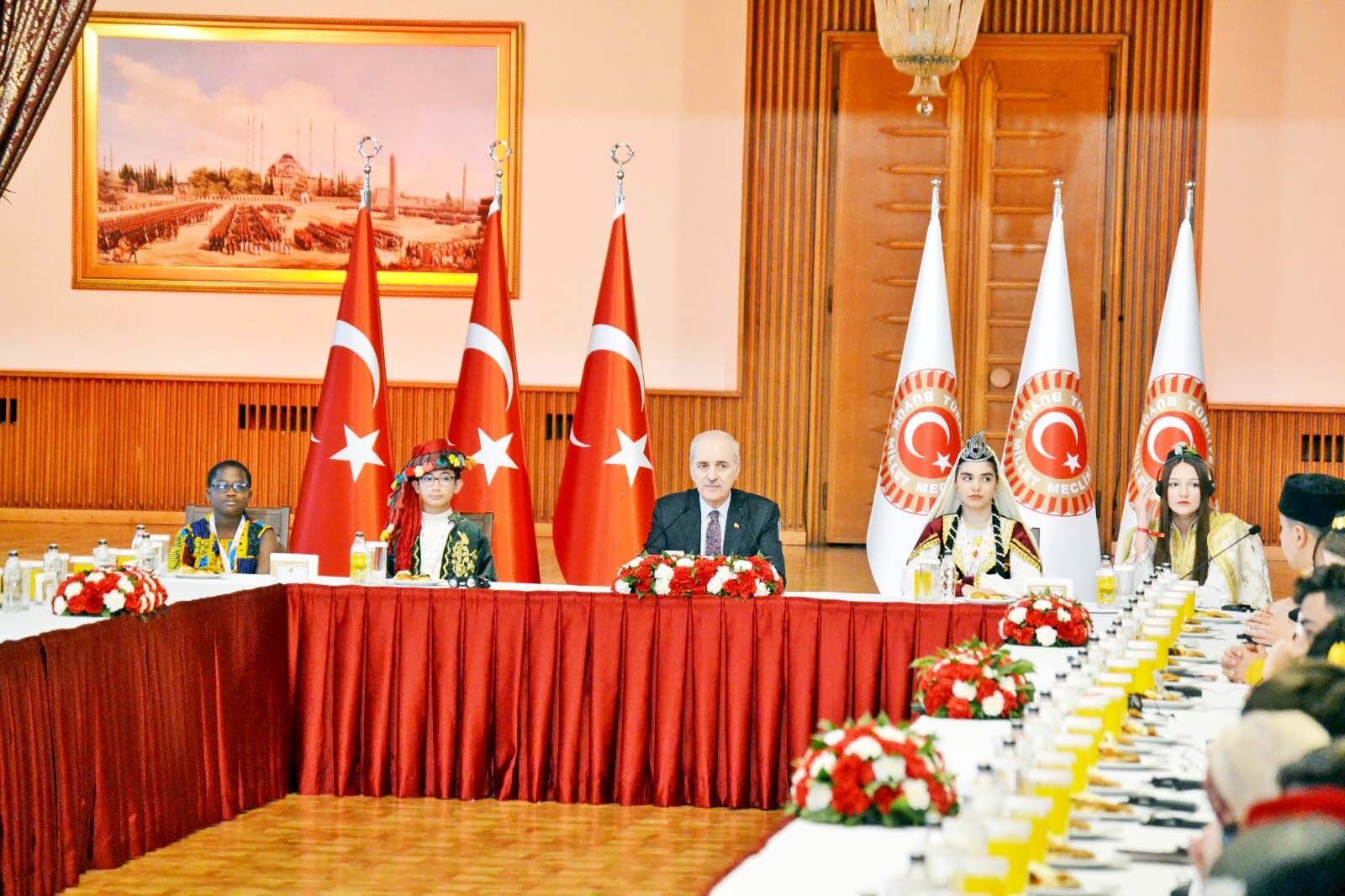 TBMM Başkanı Numan Kurtulmuş, konuşmasına dünyanın farklı coğrafyalarından gelen çocukları selamlayarak başladı. Meclis’in sadece siyasi bir kurum değil, aynı zamanda geleceğin emanet edildiği bir değerler merkezi olduğunu vurgulayan Kurtulmuş, çocukların varlığının Meclis’e ayrı bir anlam kattığını ifade etti. Kurtulmuş, “TBMM çatısı altında sizleri görmek, bu bahçede sizlerle birlikte olmak bizler için büyük bir mutluluk. Sizler, sadece kendi ülkelerinizin değil, insanlığın ortak umudusunuz.” dedi.