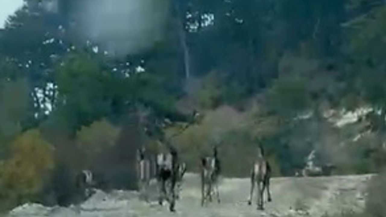 Göynük ilçesi Bozcaarmut köyü mevkisinde aracıyla seyreden kişi, ormandan inen geyik sürüsüyle karşılaştı. Sürücü, geyikleri cep telefonuyla görüntüledi. Aracın önünde koşan geyikler tekrar ormana giderek gözden kayboldu. (DHA)