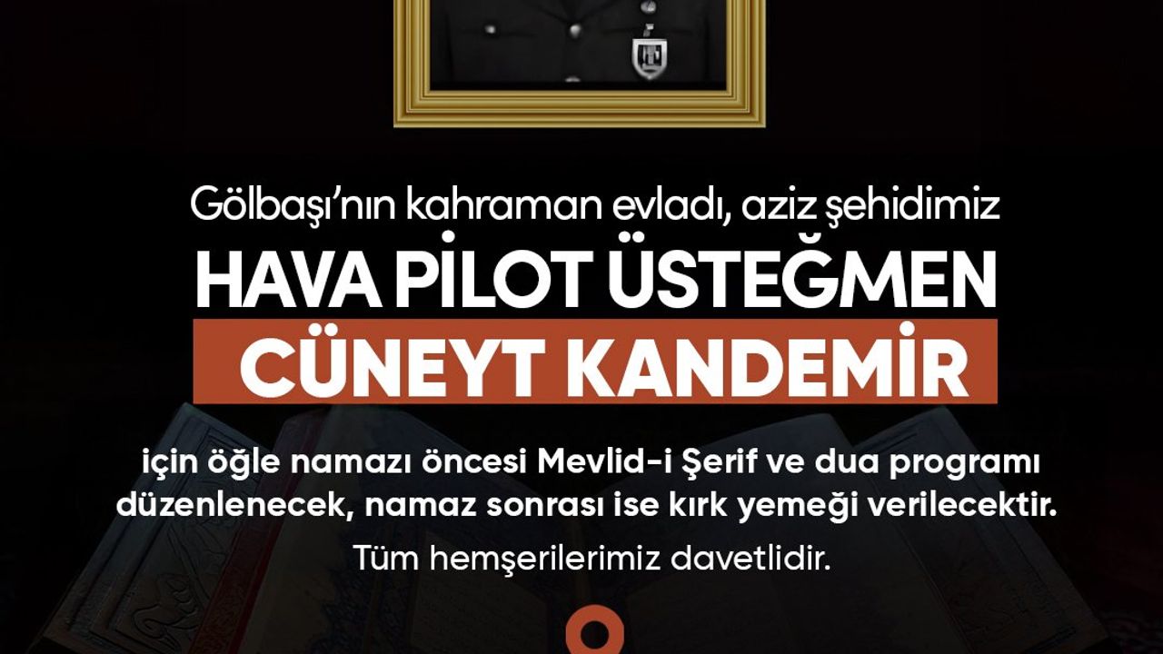 Başkan Odabaşı'nın konuya ilişkin paylaşımı şöyle:"Gölbaşı’nın kahraman evladı, aziz şehidimiz Hava Pilot Üsteğmen Cüneyt Kandemir için öğle namazı öncesi Mevlid-i Şerif ve dua programı düzenlenecek, namaz sonrası ise kırk yemeği verilecektir. Tüm hemşehrilerimiz davetlidir." şeklinde konuştu.