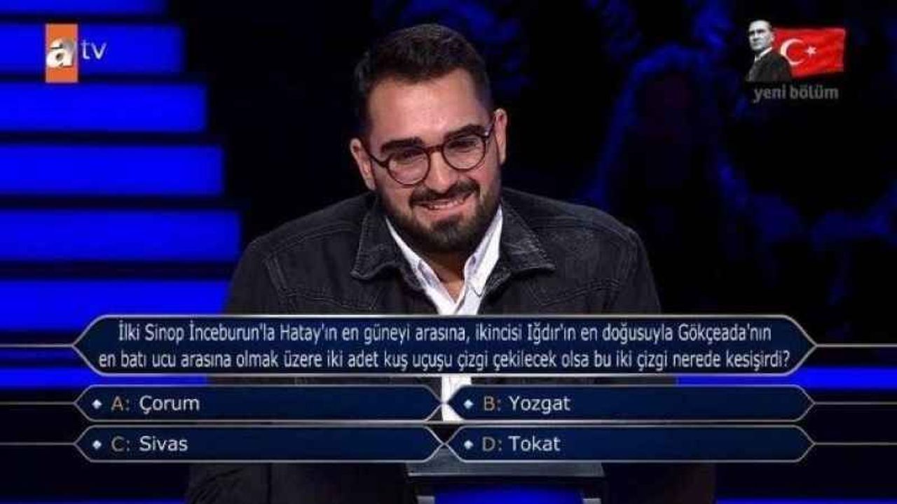 5 milyon liralık soru, "İlki Sinop İnceburun’la Hatay’ın en güneyi arasına, ikincisi Iğdır’ın en doğusuyla Gökçeada’nın en batı ucu arasına olmak üzere iki adet kuş uçuşu çizgi çekilecek olsa bu iki çizgi nerede kesişirdi?" oldu.