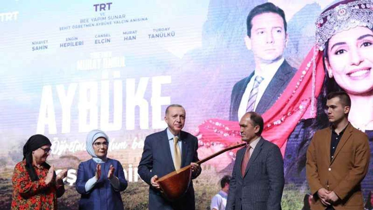 Erdoğan, filmi, eşi Emine Erdoğan, şehit öğretmen Aybüke Yalçın'ın annesi Zehra, babası Sadık, kardeşi Aybars Yalçın ile birlikte izledi. Erdoğan, filmin bitiminde sahneye eşi Emine Erdoğan ile birlikte çıktı. Erdoğan’a, şehit öğretmenin ailesi tarafından, Aybüke Yalçın'ın kullandığı bağlama hediye edildi. Erdoğan, Yalçın'ın babasından bağlamayı öperek aldı.