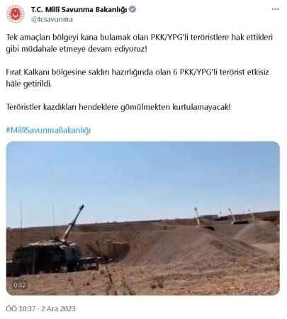 Bakanlığın sosyal medya hesabından yapılan açıklamada, "Tek amaçları bölgeyi kana bulamak olan PKK/YPG'li teröristlere hak ettikleri gibi müdahale etmeye devam ediyoruz. Fırat Kalkanı bölgesine saldırı hazırlığında olan 6 PKK/YPG'li terörist etkisiz hale getirildi. Teröristler kazdıkları hendeklere gömülmekten kurtulamayacak" denildi.