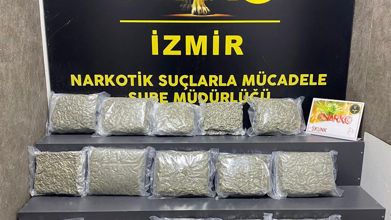 İzmir İl Emniyet Müdürlüğü Narkotik Suçlarla Mücadele Şube Müdürlüğü ekiplerince İzmir'e yüklü miktarda uyuşturucu madde getirileceği bilgisi sonrası harekete geçildi. Ekiplerce takip edilen araç, Kemalpaşa ilçesinde durduruldu. Araçta yapılan aramada 21 kilo 200 gram skunk ele geçirilirken, E.E. gözaltına alındı. Emniyetteki işlemlerin ardından adliyeye sevk edilen E.E. tutuklandı. (DHA)