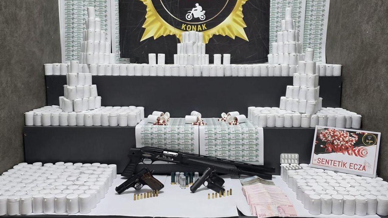 Konak İlçe Emniyet Müdürlüğü'ne bağlı Narko Alan ekipleri, uyuşturucu madde imal ve ticaretine yönelik yürütülen çalışmalar kapsamında, Hilal Mahallesi'nde belirlenen adreslere dün operasyon düzenledi. Adreslerde yapılan aramalarda; 108 bin 492 sentetik ecza (hap), pompalı tüfek, 2 ruhsatsız tabanca ve silahlara ait mühimmat ile 75 bin 100 lira ele geçirildi. Operasyonda gözaltına alınan N.P. (28), F.B. (29) ve N.K. (41) hakkında adli işlem başlatıldı.