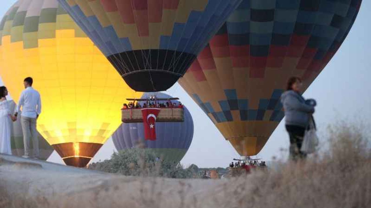 Nevşehir'in Göreme beldesinde, gün doğumundan önce uçuş için hazırlanan sıcak hava balonlarının sepetlerine, görevlilerce Türk bayrakları asıldı.