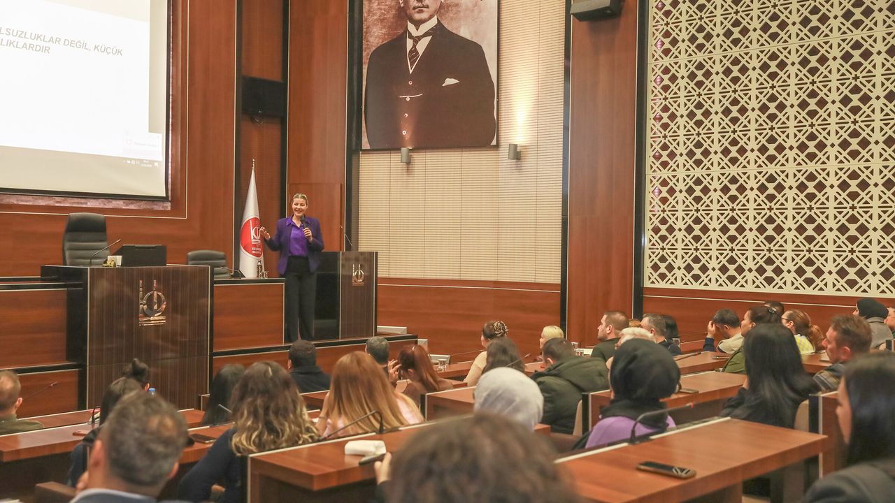 Kamu Görevliler Etik Kurulu Eğitim Uzmanı Burcu Kumrulu tarafından verilen eğitimde, “Kamu Yönetiminde Etik ve Etik Davranış İlkeleri” başlığı altında kamu görevlilerinin uyması gereken kurallar detaylı şekilde anlatıldı. Programda, 18 maddeden oluşan kamu etiği yönetmeliği çerçevesinde personelin görevlerini yerine getirirken dikkat etmesi gereken hususlar paylaşıldı.