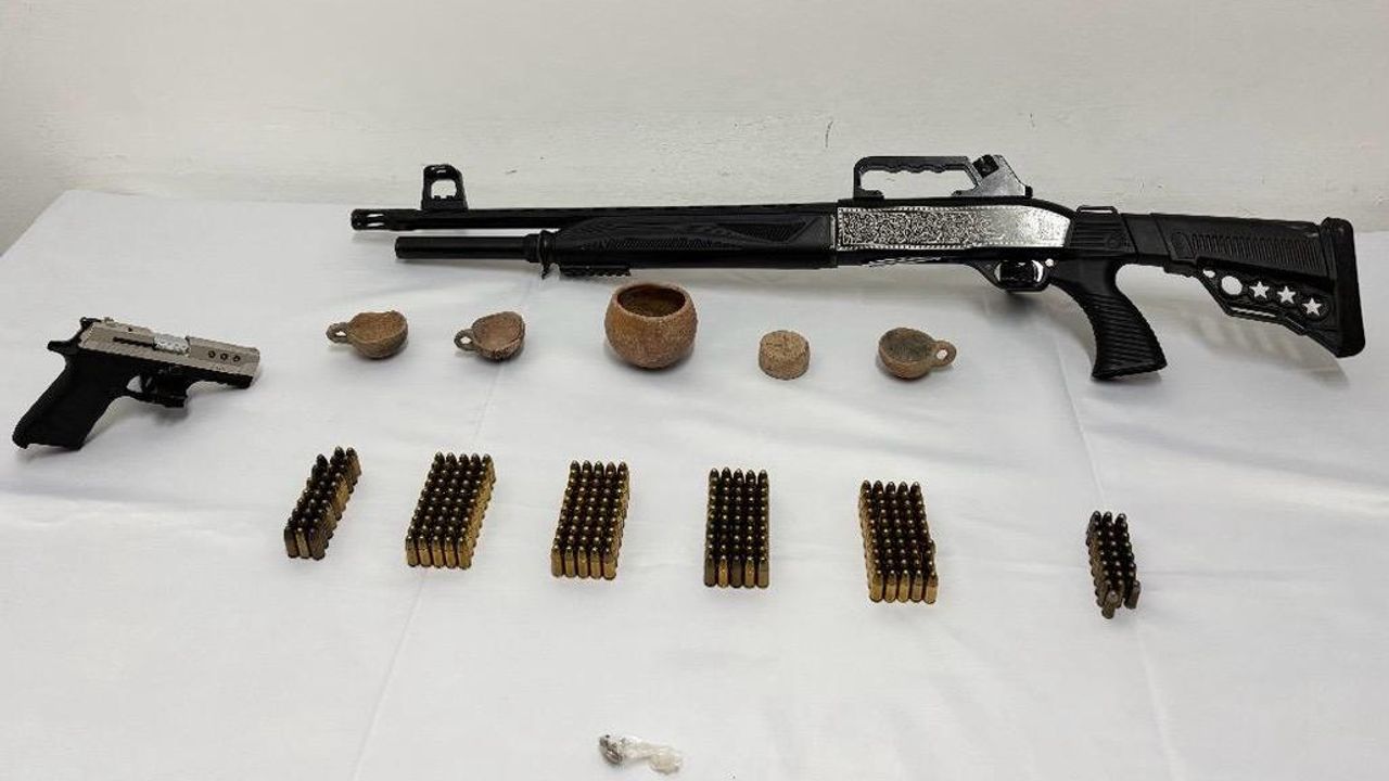 Bu kapsamda şüpheli M.T.E'nin ilçe merkezine yakın ikametinde yapılan aramada, 5 tarihi eser niteliği taşıyan obje, 1 kurusıkı tabanca, 1 ruhsatsız av tüfeği, 253 tabanca fişeği ve 34 kenevir tohumu ele geçirildi.