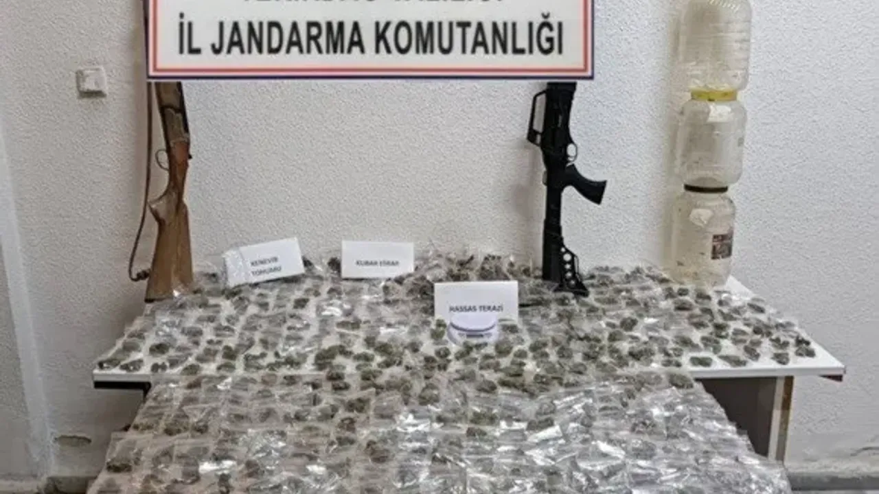 Ekiplerin evin bahçesinde ve kümeste yaptığı aramalarda toprağa gömülü plastik şişeler içerisinde satışa hazır 1 kilo 868 gram kubar esrar ele geçirildi. Aramalarda ayrıca bir miktar kenevir tohumu, 2,89 gram kenevir tohumu, hassas terazi, ruhsatsız 2 av tüfeği, suçtan elde edildiği değerlendirilen 6 bin 930 lira ile 3 cep telefonu bulundu.