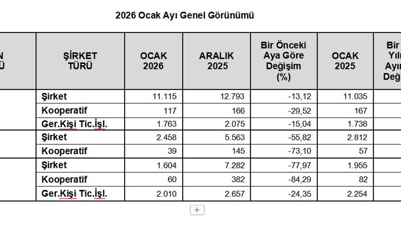 TOBB, Ocak 2026 dönemine dair kurulan ve kapanan şirket istatistiklerini açıkladı. Buna göre; bir önceki aya göre kurulan şirket sayısı yüzde 13,1; kurulan kooperatif sayısı yüzde 29,5; kurulan gerçek kişi ticari işletme sayısı yüzde 15 oranında düşüş yaşadı. Bir önceki aya göre kapanan şirket sayısında yüzde 78; kapanan kooperatif sayısında yüzde 84,3; kapanan gerçek kişi ticari işletme sayısında yüzde 24,4 oranında azalma yaşandı. Ocak 2026'da, Ocak 2025'e göre kurulan şirket sayısı yüzde 0,7; kurulan gerçek kişi ticari işletme sayısı yüzde 1,4 oranında arttı, kurulan kooperatif sayısı yüzde 29,9 düştü. Ocak 2026'da kapanan şirket sayısı 2025 yılının aynı ayına göre yüzde 18; kapanan gerçek kişi ticari işletme sayısı yüzde 10,8; kapanan kooperatif sayısı yüzde 26,8 oranında düşüş yaşadı.