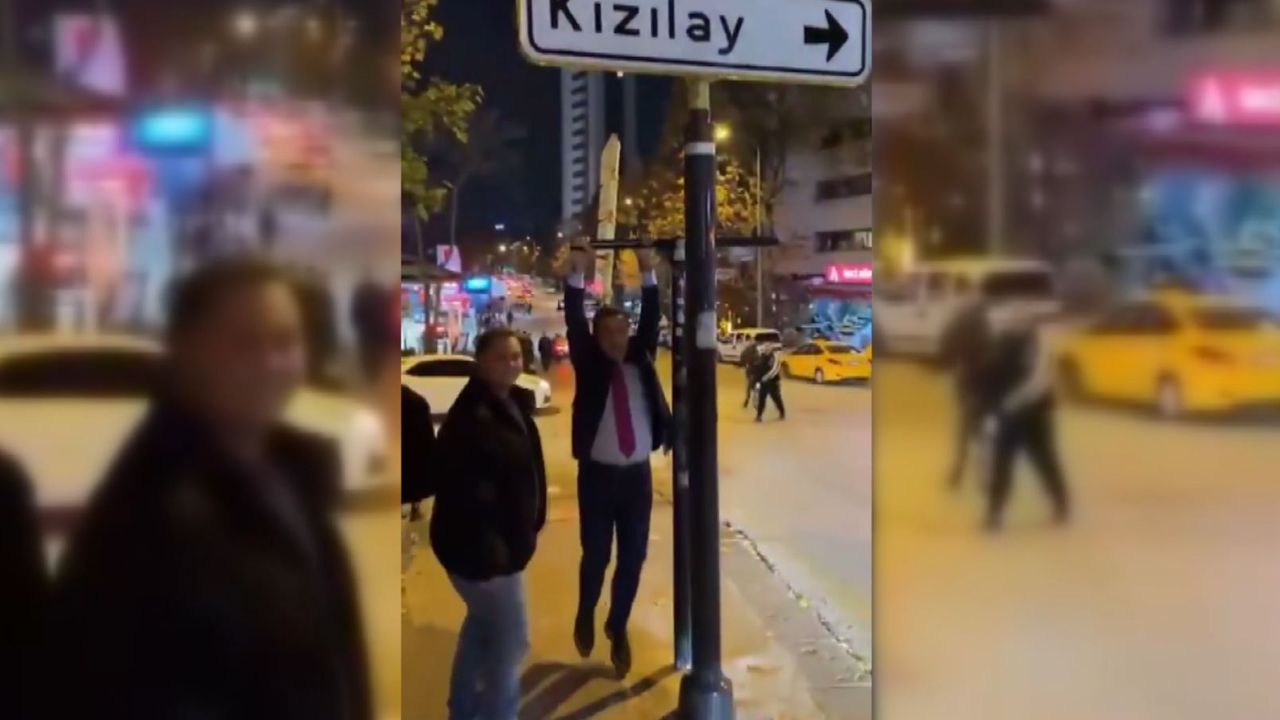 Çankaya'da Kennedy Caddesi üzerinde bulunan 'Kızılay' tabelasına asılarak fotoğraf çektirip, sosyal medyada paylaşmak gençler arasında akım haline geldi. CHP Erzincan Milletvekili Mustafa Sarıgül, yön tabelasının bulunduğu yerde gençlerle bir araya geldi. Daha sonra yön tabelasının yanındaki demire asılarak poz veren Sarıgül, “Kızılay tamam da sizleri mutlaka can Erzincan tabelasına bekliyorum" dedi. Sarıgül’ün poz verdiği anlar vatandaşlar tarafından cep telefonu ile kaydedildi. (DHA)