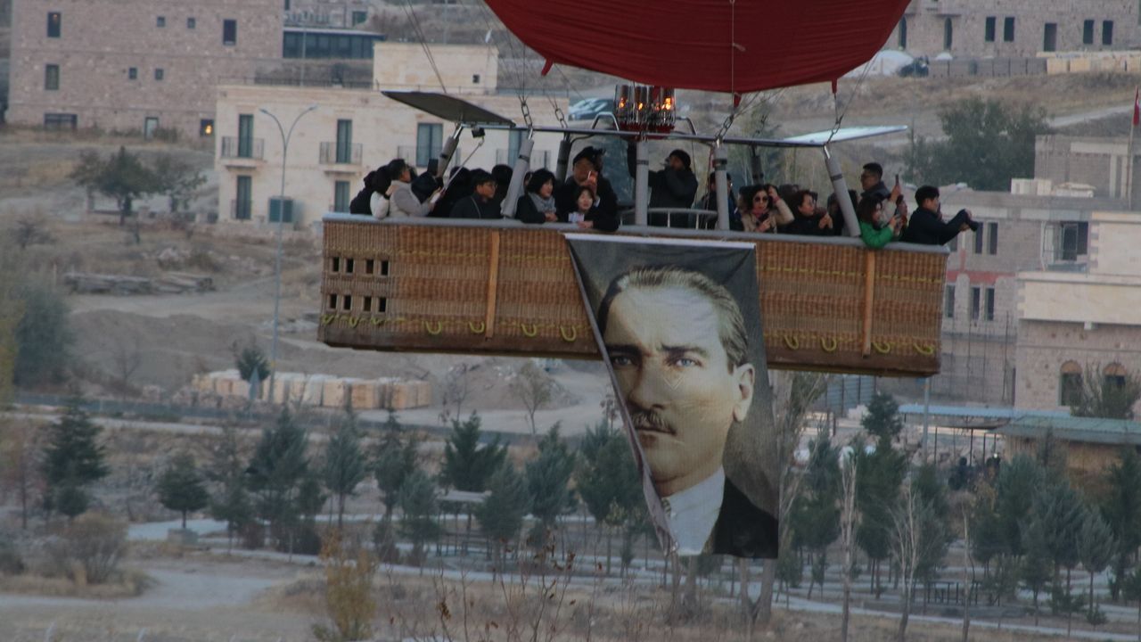 Kapadokya'da sabahın erken saatlerinde havalanan sıcak hava balonlarından bazılarının sepetlerine, Türkiye Cumhuriyeti'nin kurucusu Gazi Mustafa Kemal Atatürk'ün posterleri ve Türk bayrakları asıldı. Bölgeyi ziyaret eden yerli ve yabancı turistler, sıcak hava balonları ile fotoğraf çektirdi. Yaklaşık 1 saat Kapadokya semalarında uçan sıcak hava balonları, güzel görüntüler oluşturdu. (DHA)