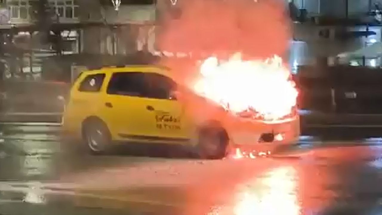 Taksinin kullanılamaz hale geldiği yangına itfaiye ekiplerinin müdahalesi cep telefonuya görüntülendi.
