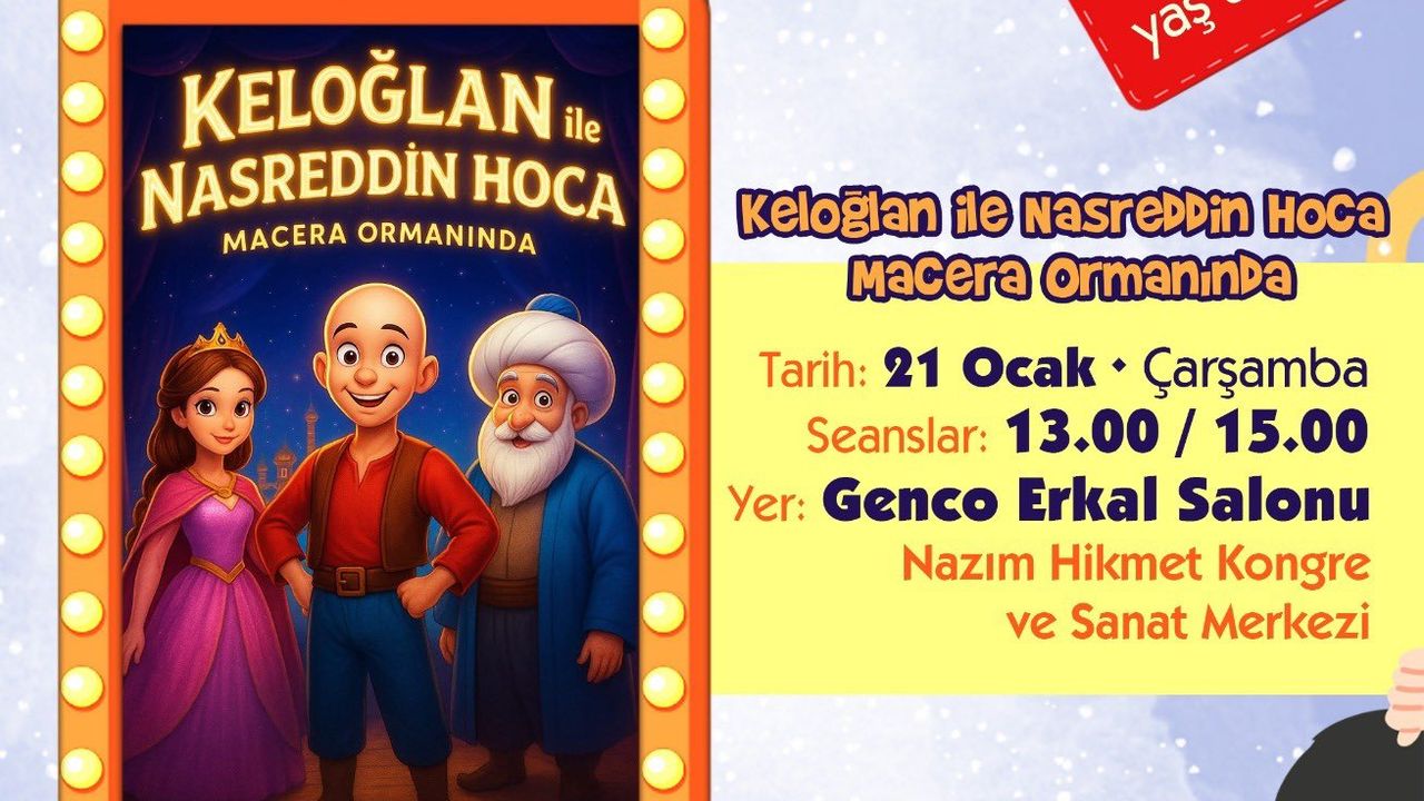 Başkan Yaşar’ın paylaşımına göre, “Keloğlan ile Nasreddin Hoca Macera Ormanında” adlı tiyatro oyunu, Nazım Hikmet Kongre ve Sanat Merkezi Genco Erkal Salonu’nda iki seans halinde izleyiciyle buluşacak.