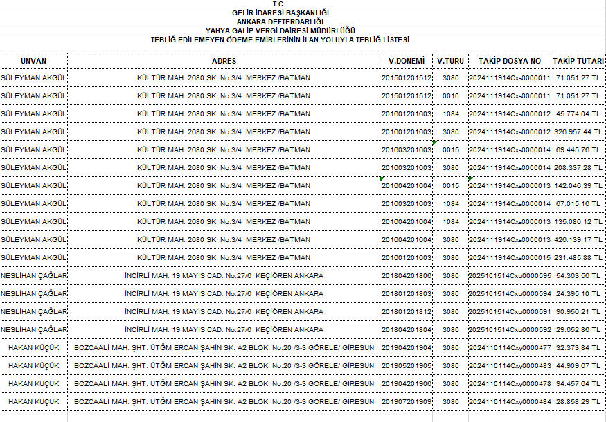 Yukarıda Adı Soyadı(Ünvanı)-Vergi Numarası-Adresi-Vergi Türü-Vergilendirme Dönemi ve miktarı yazılı mükellefler adına tanzim olunan Ödeme Emirleri muhatabın bilinen adreslerinde tebliği mümkün olmadığından 213 sayılı V.U.K.’un 103. maddesi gereğince ilan yoluyla tebliğine karar verilmiştir. Bu nedenle 213. sayılı V.U.K.’un 105 ve 106. maddeleri gereğince; “İlan yazısının askıya çıkarıldığı tarihi izleyen 15. gün ilan tarihi olarak kabul edilir. İlan tarihinden başlayarak bir ay içerisinde Yahya Galip Vergi Dairesine bizzat veya bivekale müracaat etmeleri veyahut taahhütlü mektup veya telgrafla açık adreslerini bildirmeleri”, “kendilerine süreyle kayıtlı resmi tebliğ yapılacağı”, “ilan tarihinden başlayarak bir ay içinde ne Vergi Dairesine müracaat yapmış ve ne de adresini bildirmiş olanlara bir ayın sonunda tebliğ yapılmış sayılır.”