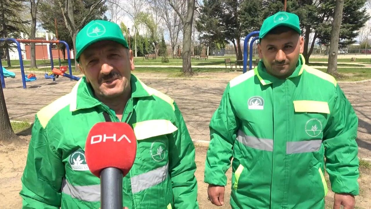 Osmangazi Belediyesi Temizlik İşleri Müdürlüğü’nde görev yapan Enes Akbulut (33) ile Gülamir Taş (48), Yunuseli Mahallesi’ndeki çocuk parkında temizlik çalışmalarını tamamladıktan sonra mola verdi. Bankta dinlenmek yerine tahterevalliye binen iki işçi, dakikalarca eğlenerek keyifli anlar yaşadı.