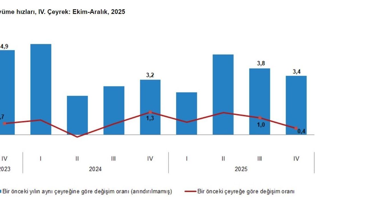 GSYH 2025 yılının 4'üncü çeyrek ilk tahmini; zincirlenmiş hacim endeksi olarak, bir önceki yılın aynı çeyreğine göre yüzde 3,4 arttı. Mevsim ve takvim etkilerinden arındırılmış GSYH zincirlenmiş hacim endeksi, bir önceki çeyreğe göre yüzde 0,4 arttı. Takvim etkisinden arındırılmış GSYH zincirlenmiş hacim endeksi, 2025 yılının 4'üncü çeyreğinde bir önceki yılın aynı çeyreğine göre yüzde 3,4 arttı. Üretim yöntemiyle Gayrisafi Yurt İçi Hasıla tahmini, 2025 yılının 4'üncü çeyreğinde cari fiyatlarla bir önceki yılın aynı çeyreğine göre yüzde 41,4 artarak 18 trilyon 467 milyar 295 milyon TL oldu. GSYH'nin 4'üncü çeyrek değeri cari fiyatlarla dolar bazında 438 milyar 605 milyon olarak gerçekleşti.