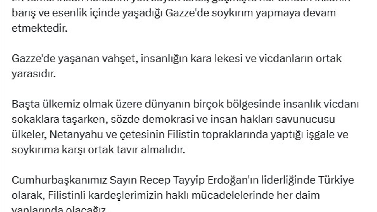 Adalet Bakanı Yılmaz Tunç, İsrail'in Gazze'de sivillere yönelik başlattığı saldırıların 2'nci yıl dönümü nedeniyle sosyal medya hesabından açıklama yaptı. Bakan Tunç, "Gazze'de 7 Ekim 2023 tarihinden bu yana, tam 2 yıldır işgalci İsrail tarafından katliama uğrayan Filistinli kardeşlerimizin yaşadığı acı nedeniyle yüreğimiz parçalanmaktadır. En temel insan haklarını yok sayan İsrail, geçmişte her dinden insanın barış ve esenlik içinde yaşadığı Gazze'de soykırım yapmaya devam etmektedir. Gazze'de yaşanan vahşet, insanlığın kara lekesi ve vicdanların ortak yarasıdır. Başta ülkemiz olmak üzere dünyanın birçok bölgesinde insanlık vicdanı sokaklara taşırken, sözde demokrasi ve insan hakları savunucusu ülkeler, Netanyahu ve çetesinin Filistin topraklarında yaptığı işgale ve soykırıma karşı ortak tavır almalıdır. Cumhurbaşkanımız Sayın Recep Tayyip Erdoğan'ın liderliğinde Türkiye olarak, Filistinli kardeşlerimizin haklı mücadelelerinde her daim yanlarında olacağız. Daha adil bir dünya mümkündür şiarıyla her zaman adaleti, hakkı ve hakikati savunacak; bebek katili İsrailli yetkililerin hak ettikleri cezayı almaları için uluslararası hukuk önünde girişimlerimize devam edeceğiz. Barbar İsrail'in hain saldırılarında şehit olan tüm Filistinli kardeşlerimize Allah'tan rahmet, yaralı kardeşlerimize acil şifalar diliyorum" ifadelerini kullandı. (DHA)