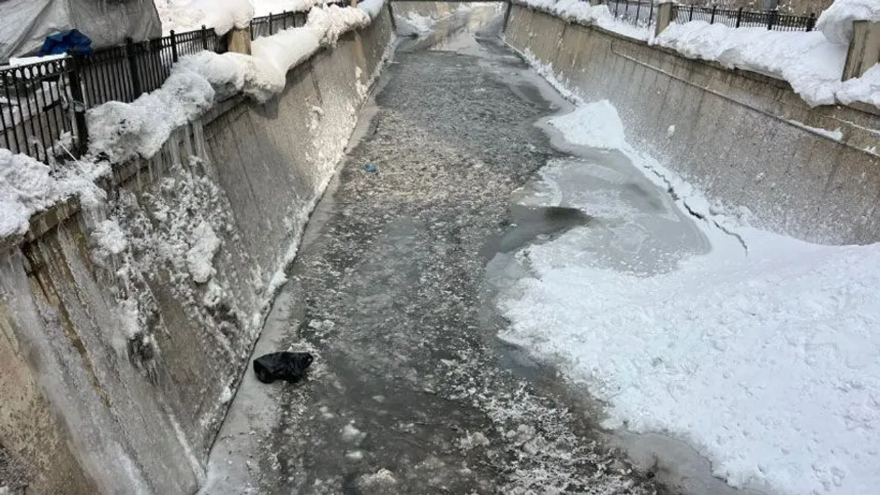 Karla çevrili dere yatağında oluşan doğal manzara dikkat çekerken, ördeklerin zorlu kış şartları altındaki görüntüsü dron kamerasıyla kaydedildi. Ortaya çıkan görüntüler, bölgedeki kışın sert yüzünü bir kez daha gözler önüne serdi.